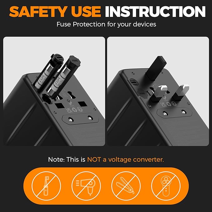- Safety Protection: TESSAN universal travel adapter worldwide with double fuse effectively protect your devices, guard your travel security; NOTE: This universal outlet only works on 100V to 250V wide voltage devices. If you want to use hair dryer, straightener, curling irons, they need to support wide voltage