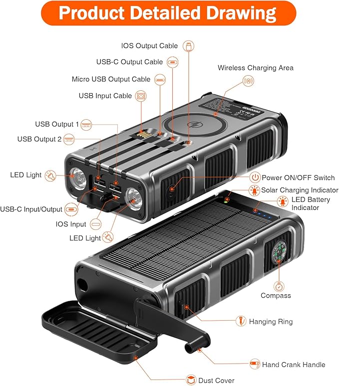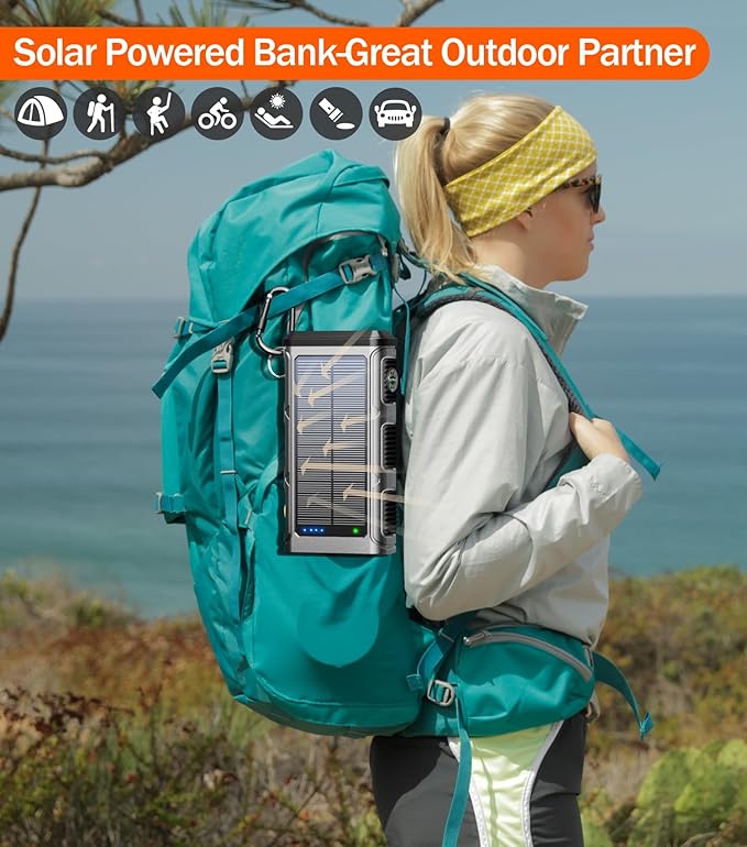 - Practical Outdoor Battery Pack: This solar portable charger has dual bright LED flashlights with 3 modes (SOS/Strobe/Steady) for power outages and other emergencies. The built-in compass clearly shows you the direction. It also comes with a carabiner, which you can hang on the backpack to charge this power bank through solar energy. Itβs well-made to be waterproof/shockproof/dust-proof, suitable for various harsh environments.