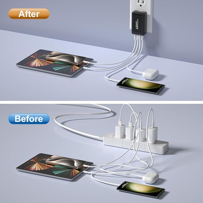 - Multi-ports USB C Wall Charger: This USB C wall charger provide 40W strong power via 2 USB-C ports and 2 USB-A ports,efficiently charging 4 devices simultaneously, works for smartphones, tablets, earbuds, headphones, smartwatches, etc.