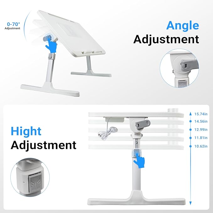 Laptop Lap Desk with Cooling Fan - Adjustable with Light, USB, Storage Drawer - Folding Bed Desk,23.62"*15.74",White