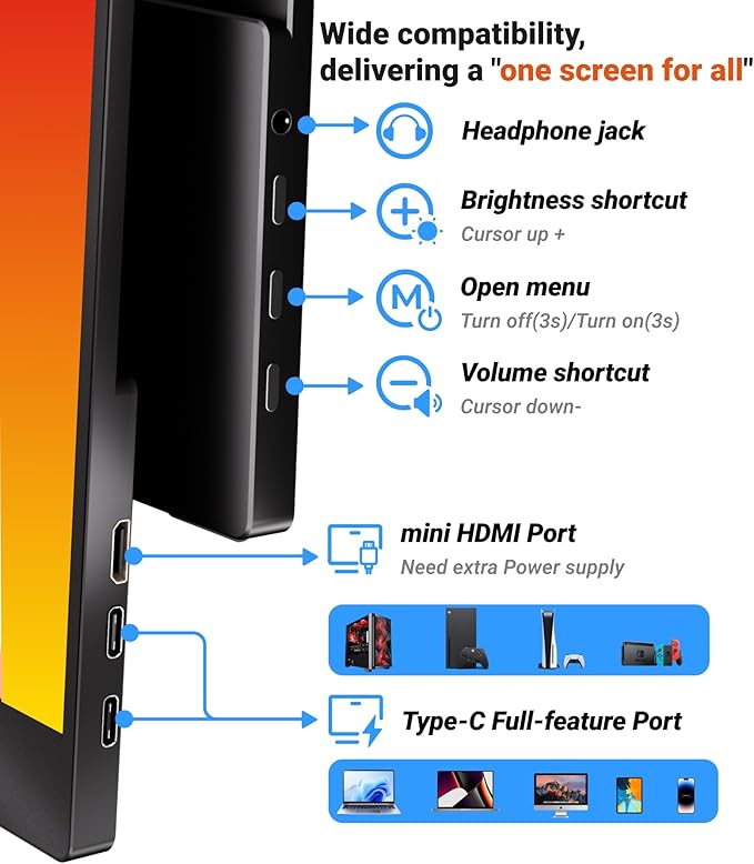 - 【Quick & Seamless Connection】Utilizing the latest USB-C technology, Ingnok Travel Monitor provides data transfer and power supply through a single cable. Compatible with various devices, including laptops, Mac,PC,and gaming consoles.