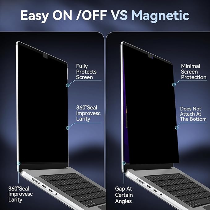 - 【Widely Applicable】Removable design and equipped with a storage clip for MacBook Pro protector, it can be carried and used as needed, perfect for various occasions where screen privacy needs to be protected. Such as offices, airports, cafes, trains, etc. This privacy filter is compatible with Macbook Pro 14 inch (2021-2024,M1/M2/M3.M4 Pro/Max) - Model:A3112, A3401, A2442, A2779, A2918, A2992