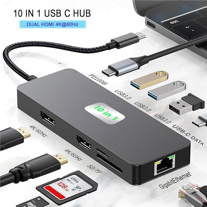 - 【USB C to Dual Monitors Docking Station】The USB C to 2 HDMI Multiport Adapter convert your usb c port into 10 ports: 2 HDMI (4K@60Hz), 1 GigabitEthernet,3 USB 3.0, 1 USB-C Data, 1 SD Card slot, 1 TF card slot and 1 PD fast charging port. Just One Hub unlock various usage scenarios in your life.