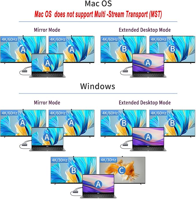 - 【Dual Monitor UHD 4K@60Hz】4K Video with 2 HDMI ports, Use HDMI port to enter extend mode for usb c laptops and transfer 4K UHD @ 60Hz from laptop screen to a monitor, projector, HDTV, etc. Stream movies, presentations or video games on your monitors in one click. Also can enter Mirror mode to watch the file,pictures,PPT etc on the big screen. support MST.