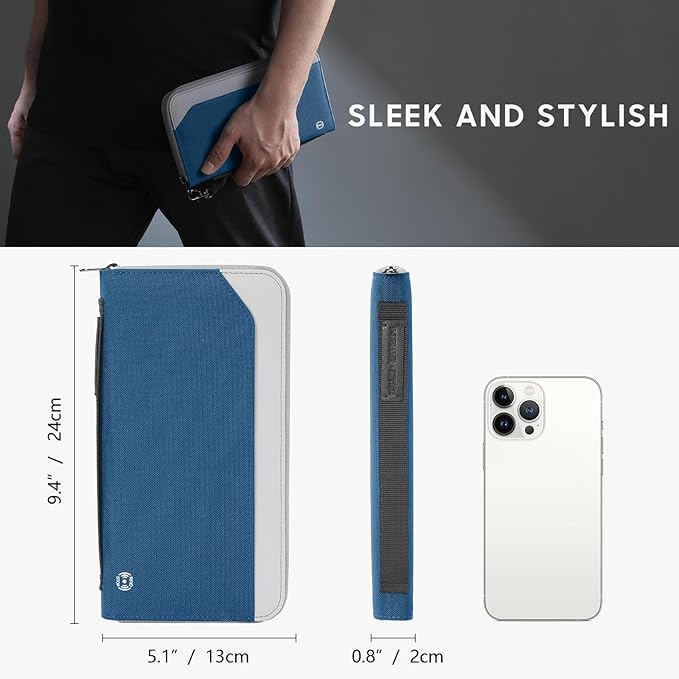 - Slim Yet Spacious Design: Measuring 9.4โ x 5.1โ x 0.8โ (24 cm x 13 cm x 2 cm), this compact passport holder accommodates up to 6 passports, 5 cards, cash, an ID, a phone, and more without adding bulk. Its lightweight, travel-ready design fits perfectly in bags, backpacks, or luggage.