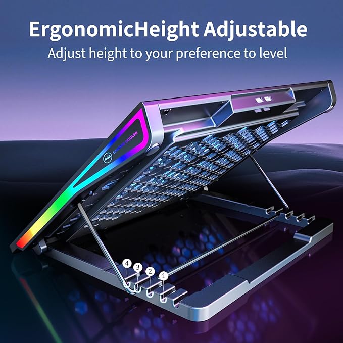 - Ergonomic comfort: The gaming laptop cooling pad provides 4 heights adjustment to choose.You can adjust the suitable angle by your needs to relieve the fatigue of the back and neck effectively.There are 2 anti-slip baffles on the surface of the laptop cooler, 17mm high and 60mm wide. It can effectively prevent your notebook from sliding off.