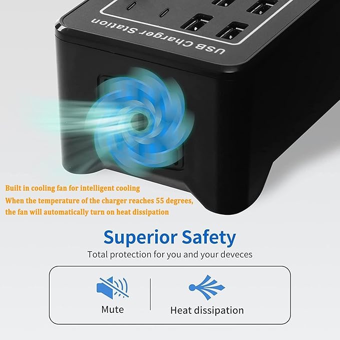 - 🔋Certified Safe : Multi Protect safety system and UL certification ensure complete protection for you and your devices. Worldwide 100-240 volt AC input voltage.When the surface temperature of the charger shell reaches 55 degrees, the intelligent heat dissipation fan automatically turns on for heat dissipation protection.