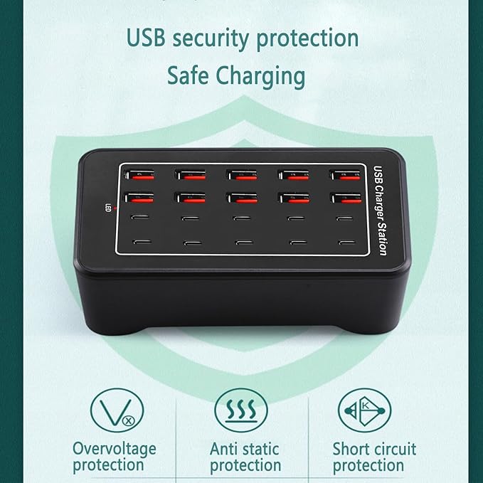 - 🔋Multi-port USB charger station: 20 ports usb c fast charger, with 10port usb charger + 10 port usb c charger, working efficiency reaches 80%, total output power is 100W. USB C Charger Compatible with iPhone 15/14/13/12/11/Xs/XS Max/XR/X/8/7/ 6s/Plus, iPad Pro/Air 2/Mini, USB Fast Charger Compatible with Samsung Galaxy S23/S22/S21/S20/S10/S9/S8/S7/Edge/Plus, Note 8/7, LG Nexus, HTC and More.