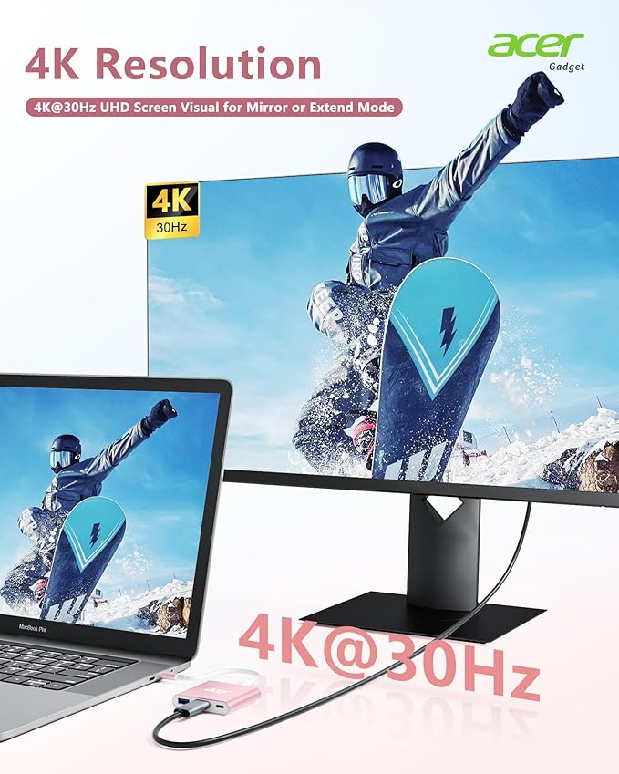 - Versatile Design: This Acer USB Hub incorporates a Type C to 100W PD port, catering to your fast charging needs with a remarkable charging capacity of up to 100 watts. Additionally, it facilitates high-definition video output at 4K@30Hz, delivering a clearer and more vibrant visual experience. The inclusion of USB 3.0 ports ensures efficient data transfer, contributing to the overall smoothness of your work and entertainment.