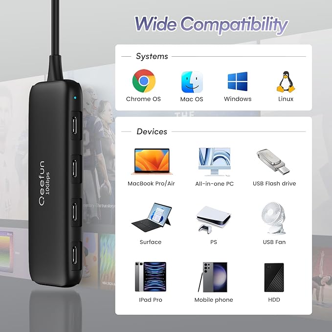 Qeefun USB C Hub 10Gbps, 4 Ports USB-C 3.2 Data Splitter, USB 3.2 Gen 2 Adapter with 100W Power Charging Port, USBC Extender for iPad Pro, iPhone 15, MacBook Air/Pro M2 M1, PC, Laptops and More