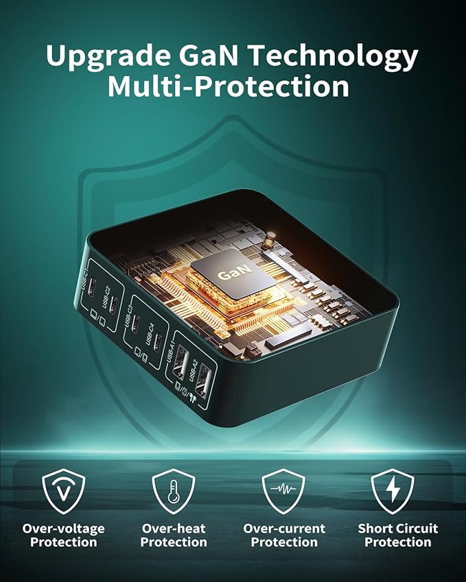 - 【130W Super-Fast Charging – More Power, Less Waiting】65W USB-C (C1/C2): Charge your MacBook Pro 13” to 50% in just 30 minutes.45W USB-C (C3/C4): Boost your iPhone 16 Pro Max from 0 to 50% in only 25 minutes. Total 130W Output – Ensures simultaneous fast charging for multiple high-power devices. Designed for busy professionals, students, and families who need quick, reliable charging throughout the day.