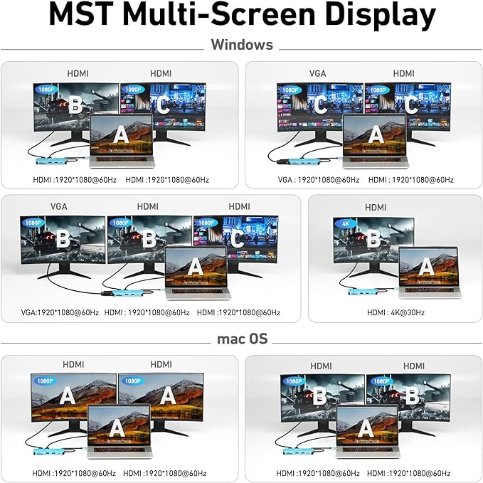- MultiScreen Solution - With MST feature support, BENFEI USB Type-C HUB could support up to 3 maximum screen output, 2*HDMI and VGA. The screen could be identical or different depends on your computer setting. The resolutions could be up to 3840*2160@30Hz, 1920x1080@60Hz (1080p Full HD) including 720p, 1600x1200; Please pay attention: the supported resolution is up to the output combination, please refer to the product description.