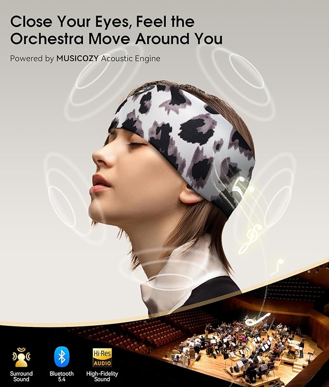 - ADVANCED 5.4 VERSION MUSIC HEADBAND - Experience excellent stereo sound quality with MUSICOZY wireless music headband headphones, which are powered by 40 mm composite drivers. These sleeping headphones feature true HD high fidelity sound, thanks to the latest Bluetooth 5.4 technology. The speakers can be adjusted to fit your ears, ensuring optimal sound quality. You can also use it as a sleep mask to help you fall asleep faster and more comfortably.