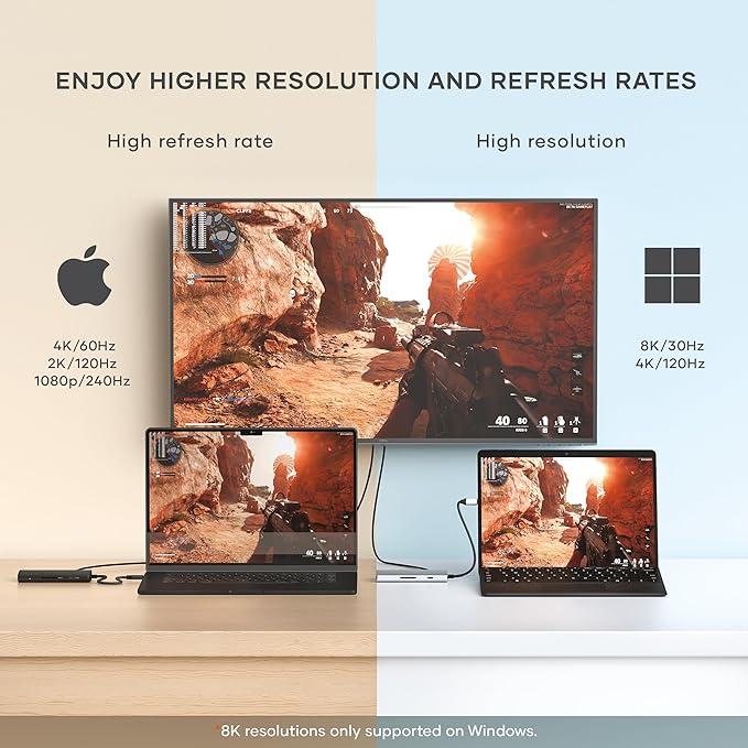- Enhanced Display - Immerse yourself in stunning visuals from a docking station with resolutions up to 8K @ 30Hz and high refresh rates including 4K @ 120Hz, 2K @ 144Hz, and 1080p @ 240Hz, catering to both gamers, creators, and professionals