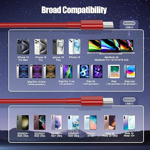 - 【Universal Compatibility】This C to C fast charging cable Compatible with 65W/61W/45W/35W/30W/25W/20W USB C charger.for iPhone Air 17 16e 16 15 Pro Plus Pro Max,for iPad Pro, for iPad Air, for iPad Mini ,for MacBook Pro, for Macbook Air , for Galaxy S25/24/S23/S22/S21, for Galaxy A56/A55/A54/A53,for Galaxy Z Flip7 FE, for Galaxy Z Fold7/6/5,for Galaxy Z Flip7/6/5,for Galaxy W25/W24/W23, for Google Pixel 10/9/8/7/6/5/4/3,for Switch, for PS5 and other USB-C port devices.