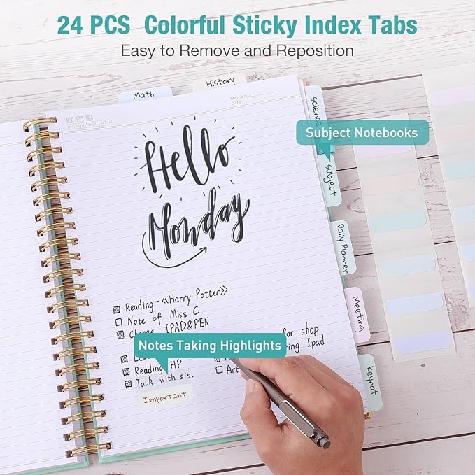 - Thoughtful Teal Notebook: ①Notebook with tabs, 24 pcs in 6 different colors sticky tabs, easily remove and reposition to mark, index, classify, and highlight. ②2 Built-in large pockets for loose leaf paper organized. ③Elastic band for secured closure. ④Elastic pen loop for different sizes’ pen accessible.