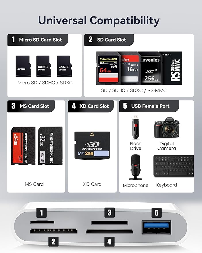 - 【5 IN 1 SD/Micro/MS/XD-Picture Card Reader】Compatible with MS XD Picture SD MicroSD cards and USB Port, This XD SD card adapter is a photographer's assistant, compatible with almost all popular SD/MicroSD/Memory Stick/XD-Picture cards, and this USB C SD card reader lets you easily view photos and videos from a variety of camera memory cards and allows you to instantly view upload the best moments of your shots anytime, anywhere.