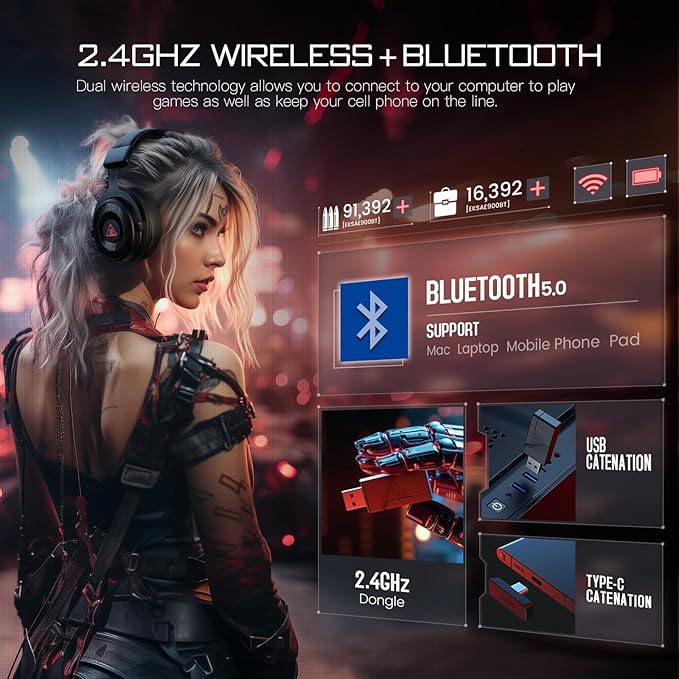- Ultra compatible with multiple devices: your gaming headset is compatible via 2.4 GHz wireless connection on PC; 3.5 mm audio jack is compatible with PC, Mac, laptop and VR. Bluetooth mode is compatible with most of your Bluetooth-enabled devices. (Please check the connectivity guide for compatibility on user manual).