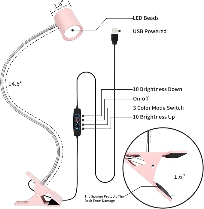 - Better Illumination Effects -The clamp desk light provides high CRI (90+) LED beads, brings you a clear and bright lighting effect while also restoring the color of an object.Bed reading light comes with a 4.9 ft USB cable that can be easily plugged into any available USB port to power the lamp (Adapter not include)