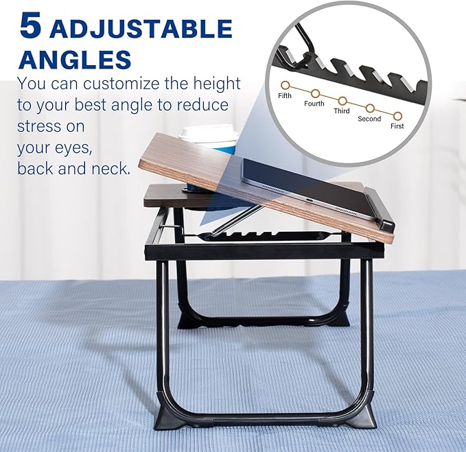 - Adjustable Laptop Desk: This lap desk desktop comes with 5 adjustable tilt angle slots that allow you to customize the height to your perfect angle, reducing the stress on your eyes, back and neck