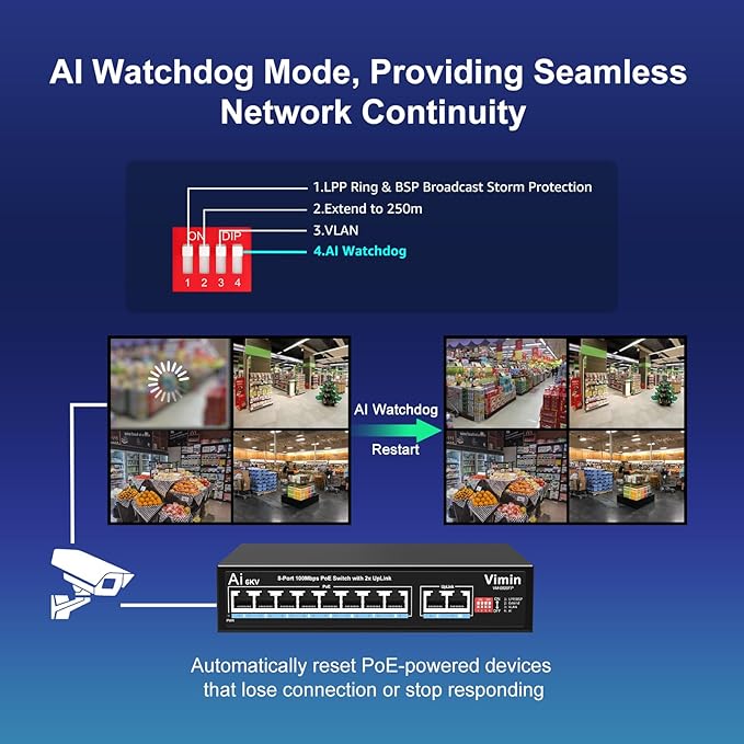 - ๐AI Watchdog Mode - This enhanced 10-Port PoE switch features AI Watchdog Mode. This advanced functionality automatically detects and rectifies port issues, guaranteeing uninterrupted power delivery to all connected devices. Elevate your network's security and reliability with seamless operation, ensuring unparalleled performance for your infrastructure.