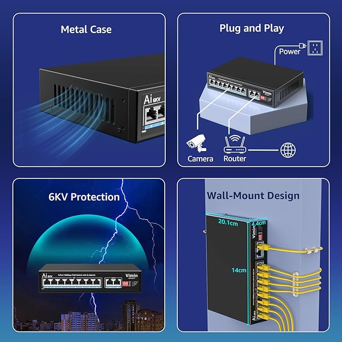 - ๐Robust Protection - The VIMIN PoE Ethernet switch hub is equipped with 4KV lightning protection, safeguarding both the switch and connected devices against voltage spikes. This feature ensures reliable and uninterrupted network performance, even in challenging environments.