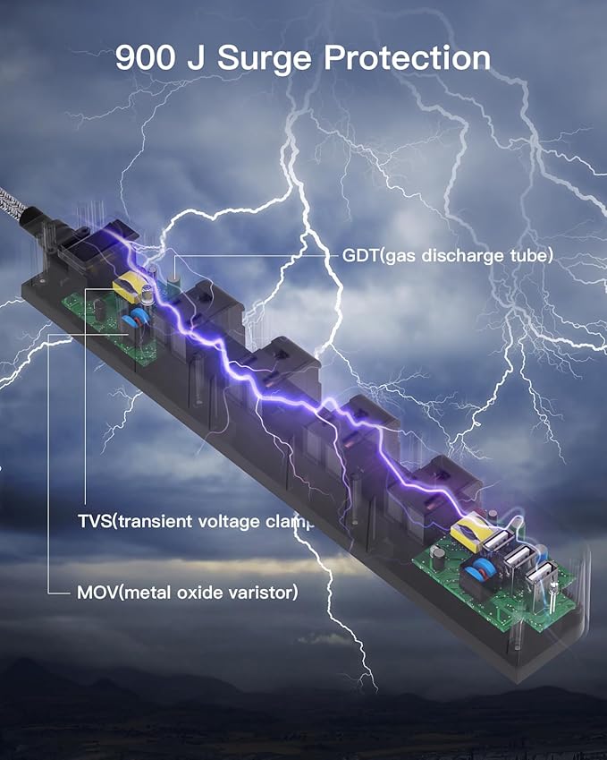- 【Surge Protection】- The electric strip has a 900-Joule energy rating providing a reliable power extension cord to protect your devices and appliances: TV, printers, computer. It secures your electronic devices from overload, short circuit, power spikes, lightning strikes, or fluctuations. (The "SURGE PROTECTED" soft indicator light on to show your devices are protected).