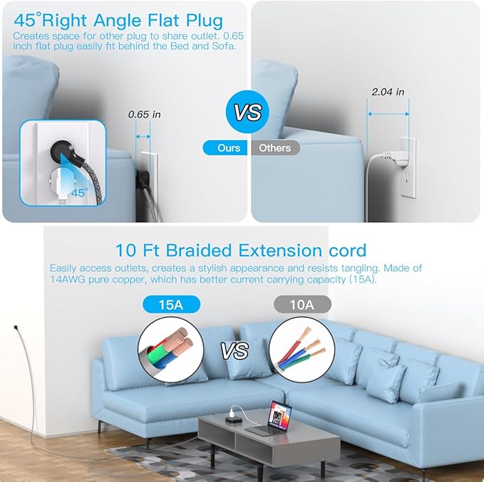 - 【10 Ft Long Power Strip & Right Angle Flat Plug】- The 10ft long extension cord is made of 14AWG pure copper, which is very thick and has better current carrying capacity (13A). The braided power cord is not easy to deform, durbale and more safety than other power cord. 45-degree low-profile angled plug design doesn’t block the bottom receptacle of your duplex wall outlet.