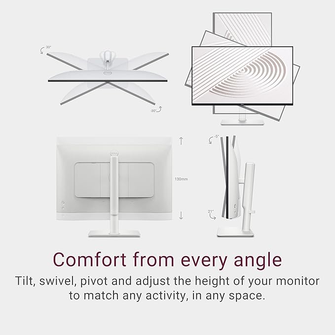 - Customize your view with tilt, swivel, pivot and adjust the height of your monitor for a comfortable setup all day long.