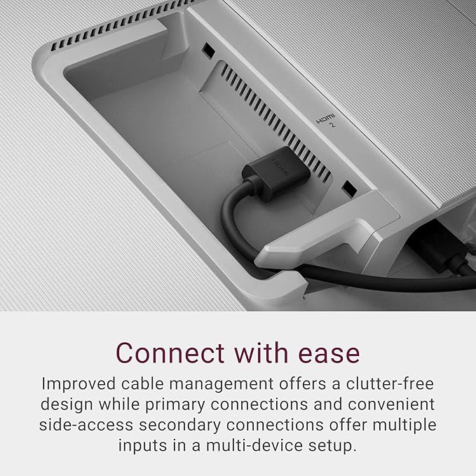 - Connect with ease with convenient primary connections and easy side access to secondary connections that offer multiple input ports in a multi-device setup. An improved cable management design offers a more pleasing, clutter-free set up that optimize your desk space. You can also navigate and manage the OSD menus with new joystick and shortcut buttons on the back of the monitor.
