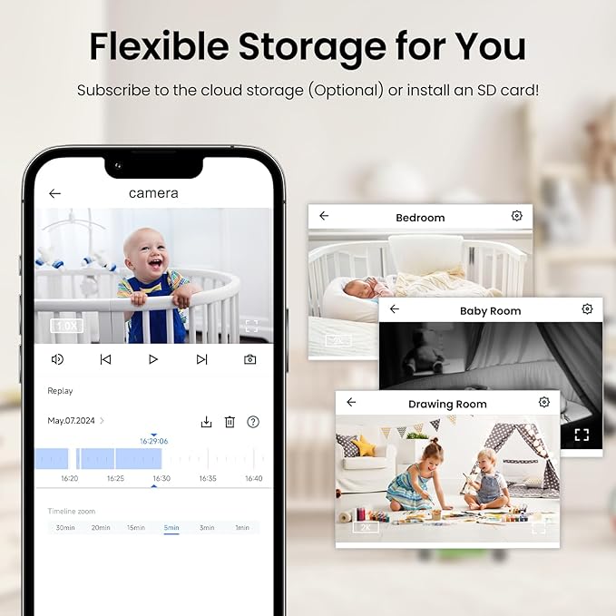 - 【5MP Super HD & Excellent Night Vision】: Cinnado baby camera monitor with 3K 5MP resolusion provides a crystal and vivid live stream, captures every detail clearly. While your baby or pet plays, you can double-click to zoom in on the video to see the details you care most. Nothing escapes your baby monitor! Built-in 4 940nm invisible IR lights, this 5MP baby camera displays high-quality video even in low light conditions at night, allowing you to see your baby clearly.