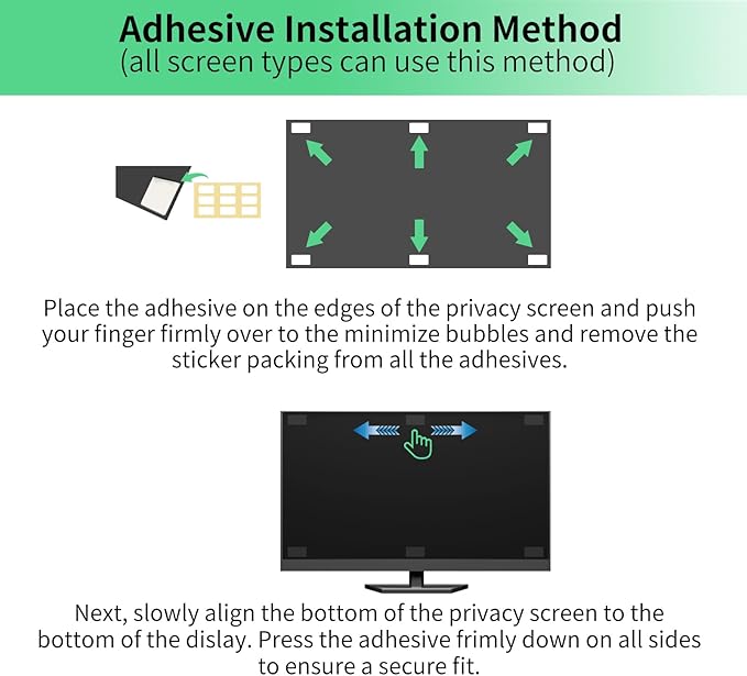 - 【Easy to Install & Reusable】 Our 34 inch privacy screen for monitor has 2 uniquely designed installation methods: ① Permanent installation- double sided adhesive tape. Suitable for all computers with a screen aspect ratio of 21:9 and a size of 34 inches. ② Removable installation- slide mount tab. Suitable for computer with raised frame, you can slide the filter in and out of the screen as needed, it provide a quick and easy way to remove your monitor privacy filter when you don't need.
