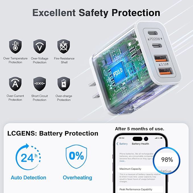 - Universal Compatibility Power Adapter:USB C fast charger plug features 4 ports and is compatible with all electronic devices, including iPhone, iPad, Samsung Galaxy, and iPhone 17/17 Pro/17 Pro Max/17 Air/16/16 pro/16 pro max,AirPods4,Watch10,Ultra2. Perfect for a wide range of devices, ensuring fast and efficient charging for all your gadgets
