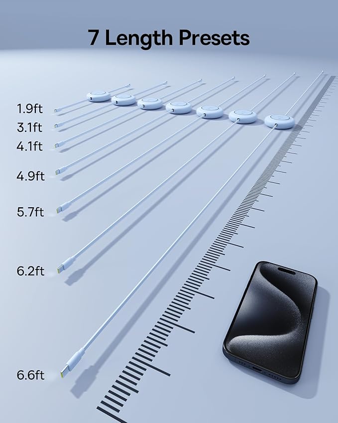 • Longer Length Updated: The 6.6ft Retractable USB C Cable Features a 7-Stage Length Preset, Allowing It to Accommodate Various Charging Scenarios and Ensuring Flexibility no Matter the Distance.