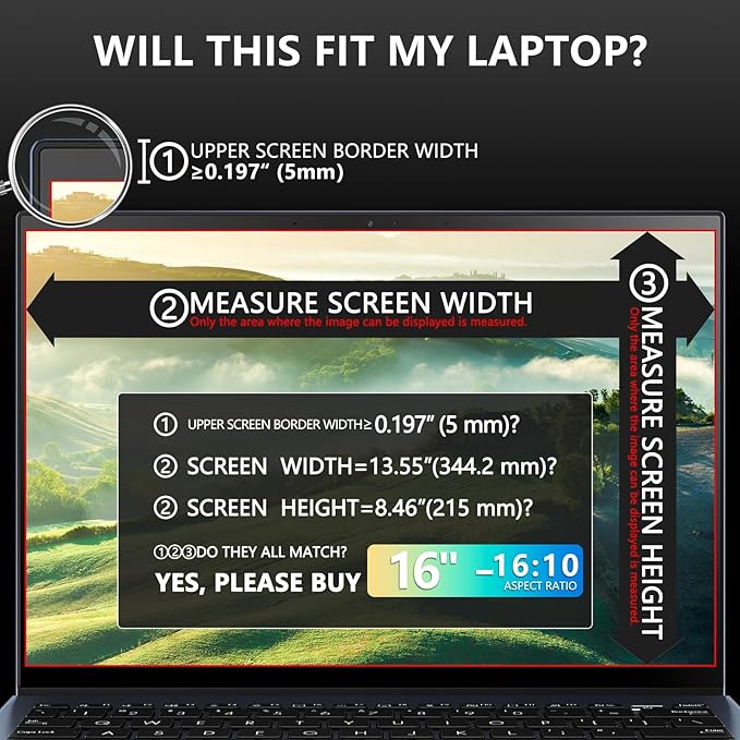- [Please Measure Length & Width] FILMEXT Magnetic privacy filter for laptop 16 inch 16:10 ratio , Width: 13.57 inch (344.68 mm), Height : 8.48 inch (215.39 mm)). Diagonal: 16 inch 16:10 ratio (universal-16"16:10, Not for Macbook or TouchScreen or 16:9, Do not fit for ThinkPad ) -Please confirm width and height for your laptop screen before ordering and feel free to contact us if you have any questions about the size.