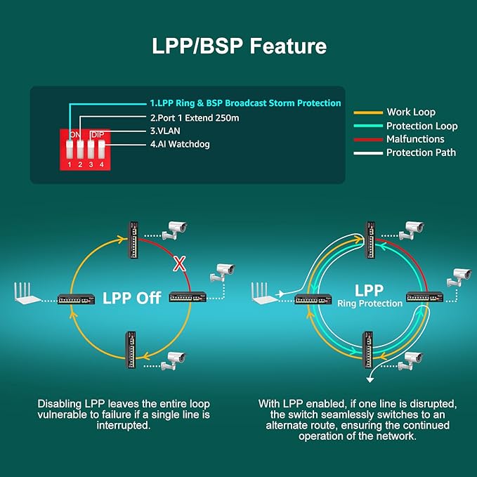 - ๐AI Watchdog Mode - This enhanced 10-Port 1000Mbps ethernet PoE switch features AI Watchdog Mode. This advanced functionality automatically detects and rectifies port issues, guaranteeing uninterrupted power delivery to all connected devices. Elevate your network's security and reliability with seamless operation, ensuring unparalleled performance for your infrastructure.