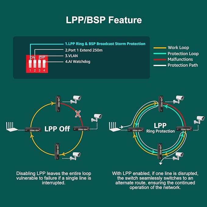 - ๐AI Watchdog Mode - This enhanced 6-Port 1000Mbps ethernet PoE switch features AI Watchdog Mode. This advanced functionality automatically detects and rectifies port issues, guaranteeing uninterrupted power delivery to all connected devices. Elevate your network's security and reliability with seamless operation, ensuring unparalleled performance for your infrastructure.