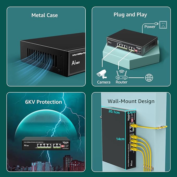 - ๐Robust Protection - The VIMIN PoE Ethernet switch hub is equipped with 4KV lightning protection, safeguarding both the switch and connected devices against voltage spikes. This feature ensures reliable and uninterrupted network performance, even in challenging environments.