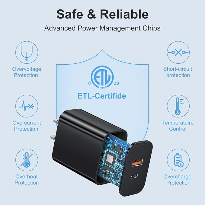 - 【iPhone 16 Charger Block】Type C Charger loaded with 20W of output power,USB-A and USB-C ports to charge two devices simultaneously at high speed.USB C adapter fast power adapter provides over-current, over-voltage,over-heat and short-circuit protection for your devices to ensure safer charging.