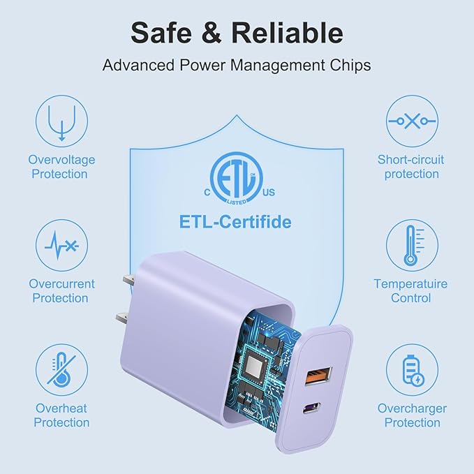 - 【iPhone 16 Charger Block】Type C Charger loaded with 20W of output power,USB-A and USB-C ports to charge two devices simultaneously at high speed.USB C adapter fast power adapter provides over-current, over-voltage,over-heat and short-circuit protection for your devices to ensure safer charging.
