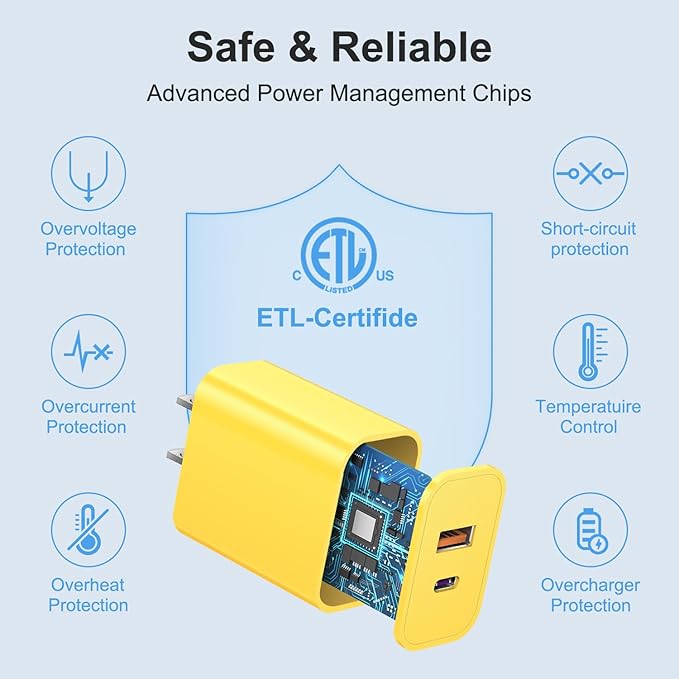 - 【iPhone 17 Charger Block】Type C Charger loaded with 20W of output power,USB-A and USB-C ports to charge two devices simultaneously at high speed.USB C adapter fast power adapter provides over-current, over-voltage,over-heat and short-circuit protection for your devices to ensure safer charging.