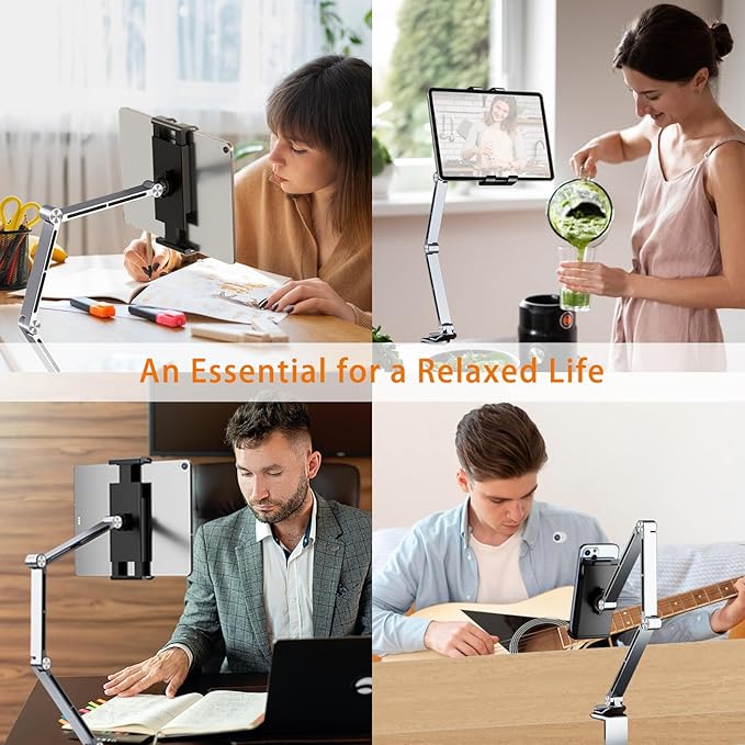 - 【FULLY ADJUSTABLE DESIGN】Featuring a 3-section long arm and 360° rotating base, this tablet holder mount offers greater flexibility and longer reach. It bends and rotates for the perfect viewing angle, whether you're standing, sitting, or lying down. Ideal for watching movies, gaming, reading, or cooking.