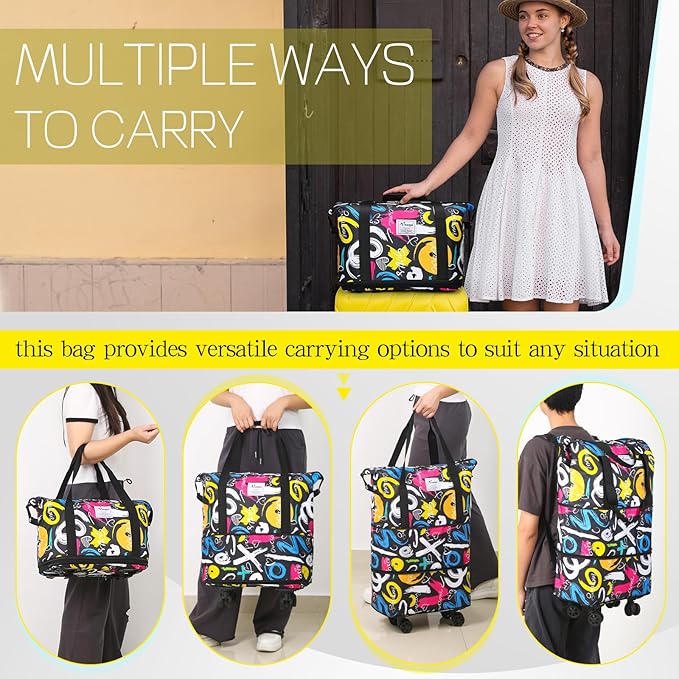 - 【Upgraded Duffel Bag with Wheels & Rolling Backpack】This foldable duffle bag for travel is crafted from thicker, scratch-resistant oxford cloth with stylish pattern, features 2 removable shoulder straps that can be adjusted between 26 to 44 inches in length, allowing seamlessly convert between carry on tote bag with luggage sleeve, rolling duffle bag with wheels, and large travel backpack. Its expandable capacity by 2 layers is with larger dimensions compared to standard market offerings