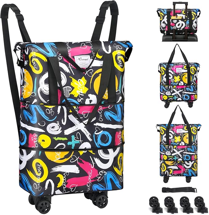 VOOWO Duffel Bag with Wheels - Rolling Foldable Expandable Duffle Bag with Wheels for Travel, Rolling Luggage Carry On Bag with Wheels, Large Rolling Backpack Weekend Bags for Men Women (Black)