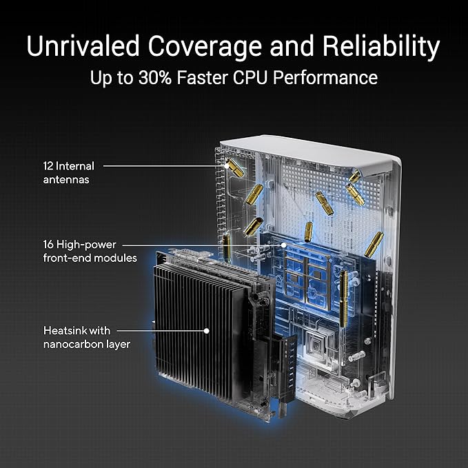 - Twelve internal antennas and sixteen high-power front-end modules eliminate WiFi dead zones in all directions while robust heat dissipation enhances WiFi reliability.
