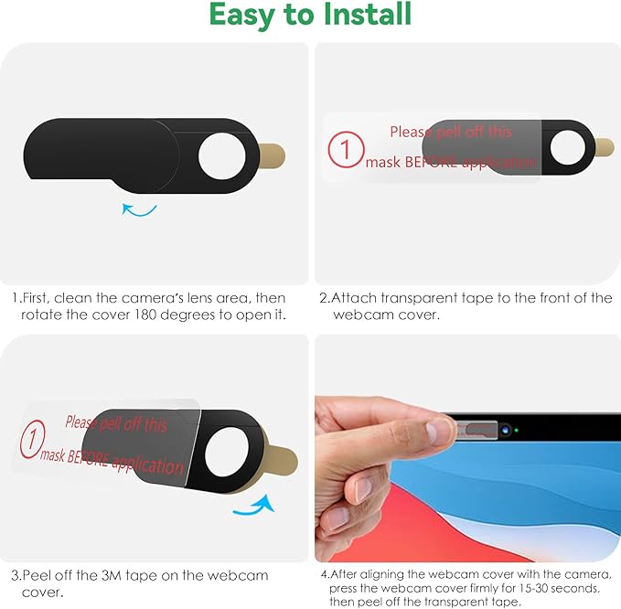 - - Easy to Install and Use: In just four simple steps, you can apply, align, press, and slide the cover to safeguard your privacy. Plus, it doesnβt interfere with the functioning or indicator light of your webcam.