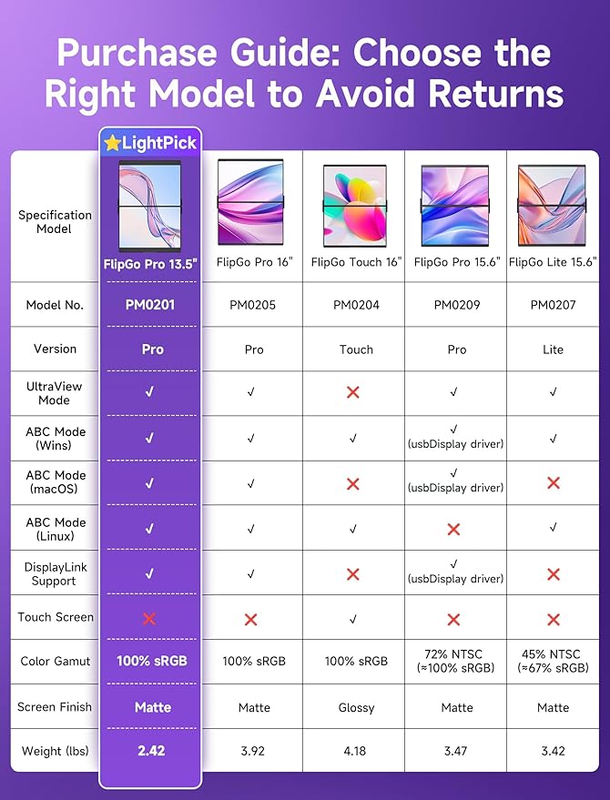 - 【Unlock Endless Possibilities】Explore three display modes with the FlipGo Pro 13.5" dual laptop screen extender: 1. Ultra Mode for expansive views, 2. Mirror Mode for overlapping multitasking, 3. Extend Mode for side-by-side work. Powered by DisplayLink technology, it offers seamless triple-screen display and boosts productivity by up to 300%. (Note: Mode support varies by system and port. See product images for details or contact our support team.)