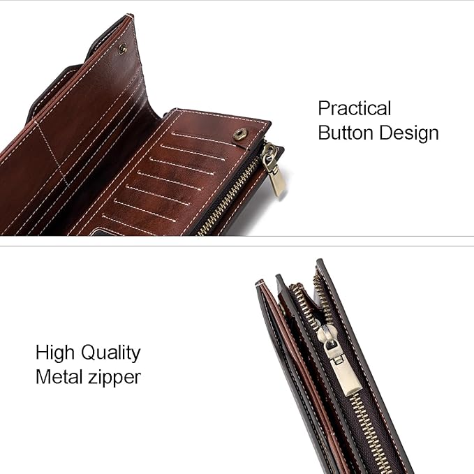 - Capacity: Features 5 receipt slots, 25 card slot, 2 ID window, 2 cash compartment/phone pocket, 1 coin zipper pocket .It can hold credit cards, ID cards, cash, coins, passports, and more, great for daily and travel use.