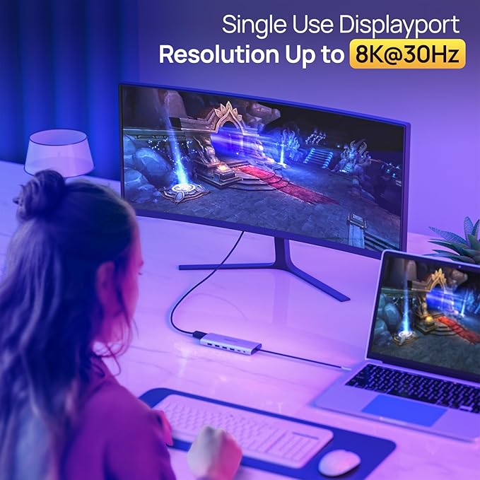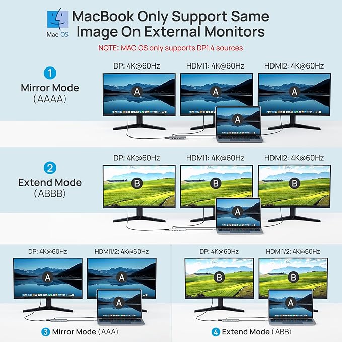 - 【Triple Display Docking Station Dual/3 Monitors】This laptop docking stations dual monitor with three high-definition video output ports: HDMI+HDMI+DP. While single use displayport resolution up to 8K@30Hz, single use HDMI resolution up to 4K@60Hz. Dual monitors will be 4K@60Hz or 4K@30Hz(DP1.4). Triple monitors will be 4K@60Hz or 4K@30H(DP1.4). Note: macOS does not support MST, three extended monitor shows the same screen