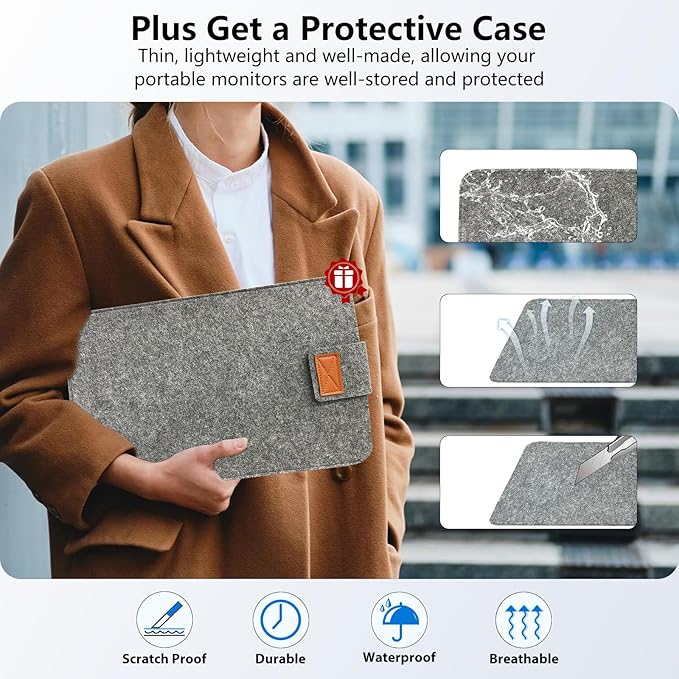 - [Get a Monitor Protective Sleeve]: The case is tailor-made for your portable laptop monitor, lightweight and durable, easy to carry, a perfect companion for your travel or daily commute, and can be easily put into your backpack. Adopts scratch-resistant and durable material, effectively reducing screen wear and tear and enhancing protection. Built-in 90Β° adjustable stand, multiple suitable viewing angles can be selected. Monitor arm can be used for more space-saving installation